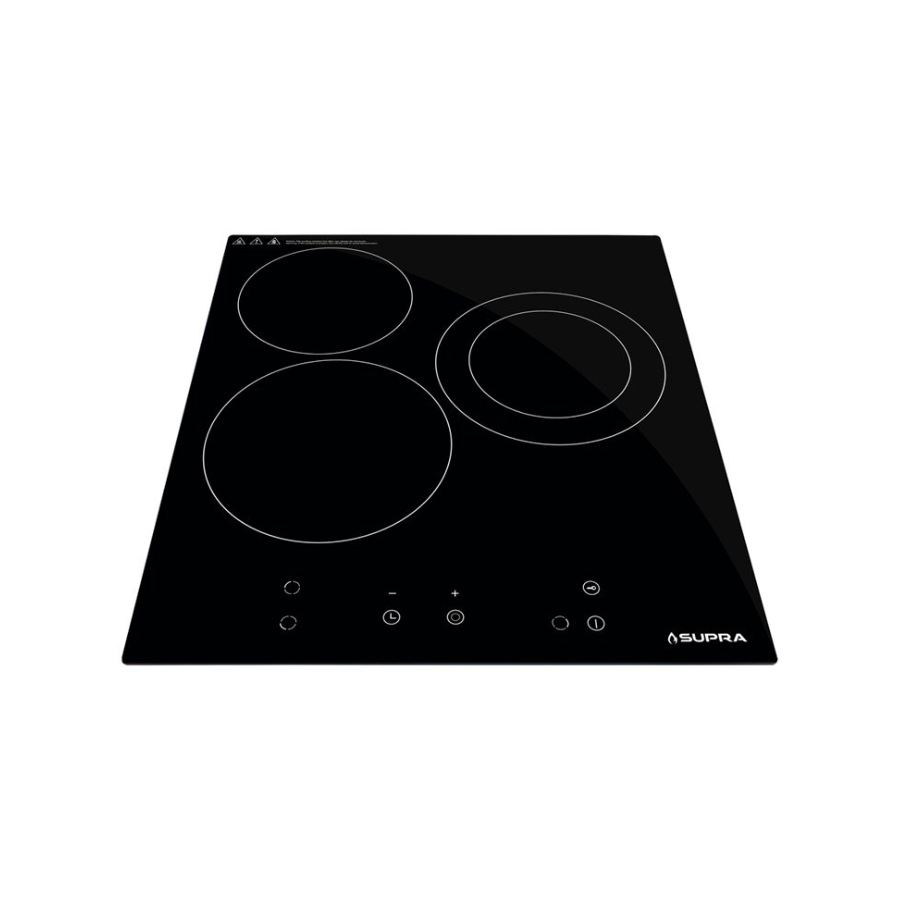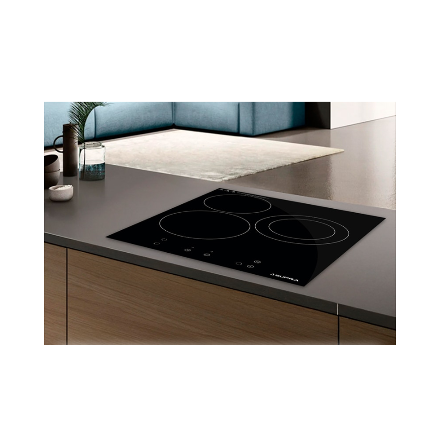 The Supra VITRO3 electric vitroceramic cooktop features three cooking zones operating at 220V for efficient residential performance. Its smooth ceramic glass surface ensures even heat distribution, easy cleaning, and a sleek modern appearance. Designed for built-in installation, it is ideal for contemporary kitchens seeking practicality and style.