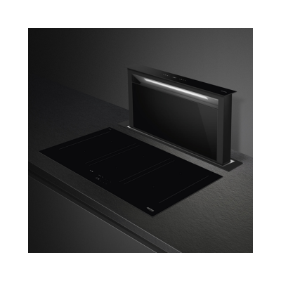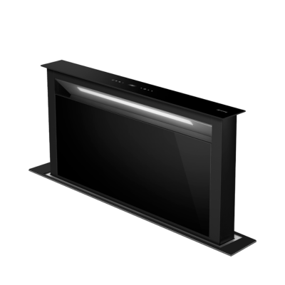Campana extractora telescópica de 90 cm con elegante acabado en cristal negro. Se instala directamente en la encimera y se eleva solo cuando se necesita, ofreciendo máxima eficiencia y estilo moderno en cocinas abiertas o con isla.